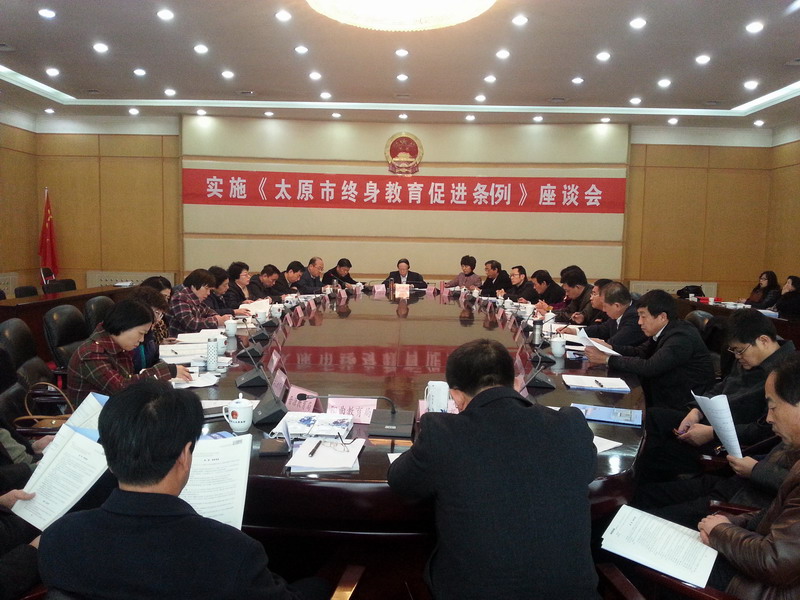 《太原市终身教育促进条例》于12月1日起施行,这使我市成为全国首个为终身教育立法的省会城市。12月1日上午,实施《太原市终身教育促进条例》座谈会在太原市人大四楼会议室召开,市人大常委会副主任傅建荣、市教育局局长马兆兴出席会议。来自市人大教科文卫委、市教育局、太原社区学院的相关人员及10个县(市、区)人大常委会分管副主任和教育局局长参加会议,共同学习《条例》,交流体会,研究实施《条例》的有效措施。会议由市人大教科文卫委主任赵雁萍主持。