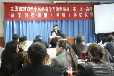 下午,太原社区大学社教办主任武晨、太原社区大学计算机中心主任郭建勇对参会人员进行了“太原市全民终身学习卡”发放推广、太原市全民终身学习网维护的培训;在李康处长的主持下,全体与会人员对《太原市县(市、区)、街道(乡镇)、社区(村)三级社区教育机构标准化建设评估指标体系(讨论稿)》进行了热烈研讨,并共同学习了《北京宣言》。