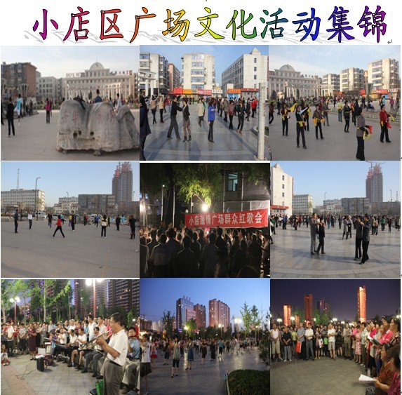 每天早晚在小店区音乐广场上健身操、交谊舞,激情澎湃;坞城街道太航社区广场上秧歌、健身舞,热情洋溢;每晚在区电业局广场上灯光闪烁,跳交谊舞的人们舞姿翩翩;学府公园广场上健身操、模特走秀、唱歌活动,各具特色。