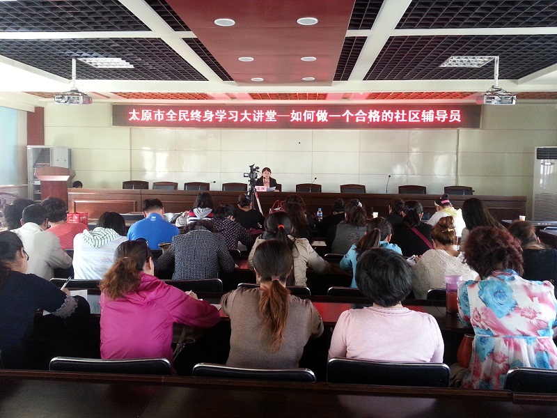 2012年9月14日下午,由太原市迎泽区教育局和太原社区学院联合举办的太原市全民终身学习大讲堂暨社区讲坛第十五讲——如何做一名合格的社区辅导员,在我市迎泽区教育局五楼会议室举行。
